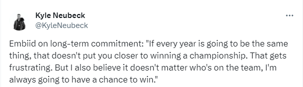 76人总经理还重申,哈登的交易必须包括一名对球队有重大帮助的球员,或者球队可以在短期内使用的选秀权。