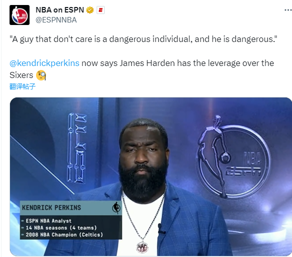 对于哈登继续逼宫离队,名嘴帕金斯在节目中表示:一个不在乎别人的人是一个危险的人,他很危险。