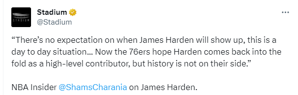 名记shams表示没人知道哈登何时会归队,这就是目前的情况,76人想要哈登继续为球队效力,但形势并不站在费城这边。