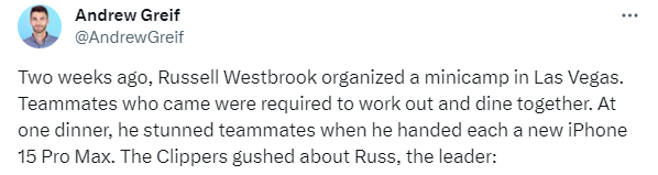 快船跟队记者Andrew Greif报道,2周签,威少在拉斯维加斯组织了一场迷你训练营,来的队友被要求一起训练和一起吃饭,在一次晚宴上(当地的一家高级餐厅),威少给在场的每一个队友发了一部iPhone 15 Pro Max,零售价为1200美元(约8661元人民币)。