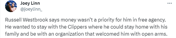 谈到今夏2年780万美元降薪续约,威少表示:在自由球员市场上,钱并不是我优先考虑的问题。我想留在快船,在这里我可以和家人待在一起,和一支张开双臂迎接我的球队在一起。