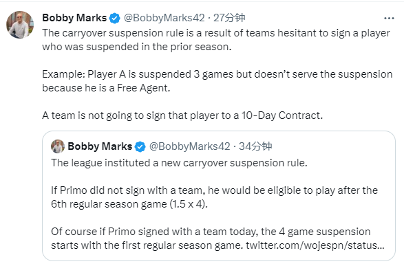 据悉,禁赛将会在普里莫被新球队签下后进行;薪资专家Bobby Marks补充报道,根据联盟新的停赛规则,如果普里莫新赛季没有签约任何NBA球队,那么他可以在新赛季第6(1.5×4)场比赛后结束禁赛;如果普里莫和NBA球队签约,那么4场禁赛将从常规赛第一场算起。