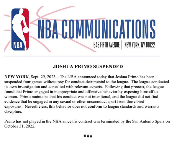 NBA官方正式宣布,普里莫因不当行为被禁赛4场,联盟进行调查并咨询了相关专家后了解到,普里莫在去年被指控向一名女性暴露自己的身体,做出了不恰当和冒犯性的行为。普里莫坚称其不是故意为之,联盟也没有发现任何证据表明普里莫在其他地方有类似的不当行为。但尽管如此,这种行为仍然不符合联盟的准则和纪律。