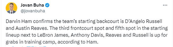 换言之,新赛季拉塞尔和里夫斯将搭档詹姆斯和浓眉首发出战,首发阵容中的第三个前场和第五个位置将在训练营中争夺产生。