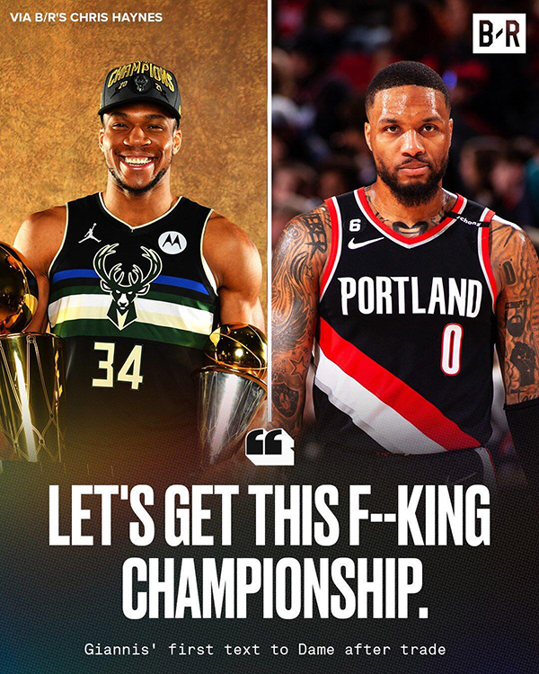 最终雄鹿、开拓者和太阳达成三方交易,利拉德加盟雄鹿联手字母哥冲击总冠军,据报道,当这桩交易官宣时,利拉德收到的第一条短信是字母哥发来的,上面写着:“让我们拿下这个该死的总冠军。”