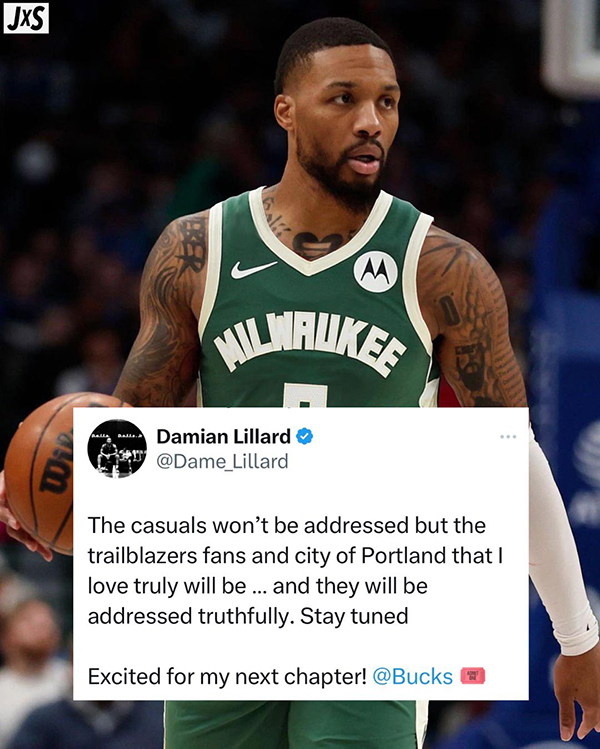利拉德加盟雄鹿后首次发声,发推写道:“我不会向那些黑子致辞,但会向开拓者的球迷和我所深爱的波特兰这座城市致以真诚的致辞。敬请期待。为我的下一篇章感到兴奋!@雄鹿