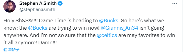 名嘴A-史密斯发推写道:我的天呐!利拉德去雄鹿啦!所以我们现在应该清楚,雄鹿将向总冠军发起冲击!字母哥不会去其他任何地方!我现在不太确定凯尔特人是否还能成为东部得热门,天呐!