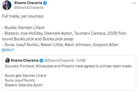太阳、开拓者和雄鹿达成三方交易,利拉德加盟雄鹿,联手字母哥冲击总冠军;据报道,开拓者将会继续交易霍勒迪,他们目前致力于培养队内的年轻后卫。