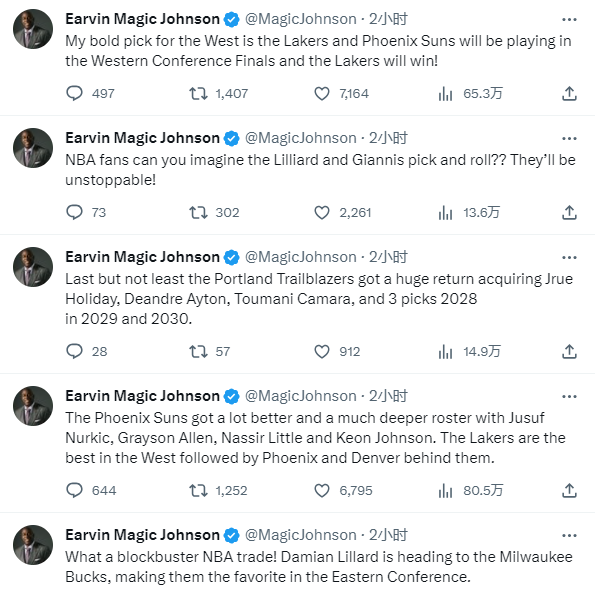 湖人名宿魔术师约翰逊发推写道:NBA的球迷们,你们能想象字母哥和利拉德的挡拆吗?这将不可阻挡;这是多么轰动的交易啊,利拉德将前往雄鹿,这将让他们成为东部冠军大热球队。