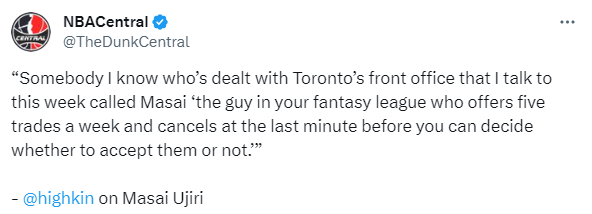 猛龙记者Sean Highkin报道,猛龙总裁乌杰里对交易的想法有些多变,该记者表示:我认识一个与猛龙管理层经常打交道的人,我本周与他交流了。他将乌杰里称为活在梦幻联赛里的那种人。乌杰里每周会给出五笔交易想法,并在对方决定是否接受之前的最后一刻取消掉。