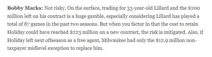 薪资专家Bobby Marks谈到了此交易对于雄鹿的意义,他表示:从表面上看,交易得到33岁的利拉德和他剩下的2亿美元合同像是一场巨大的赌博,尤其是考虑到利拉德在过去两个赛季总共打了87场比赛,但你知道吗,留住霍勒迪的新合同成本可能达到2.23亿美元,风险就会降低。
