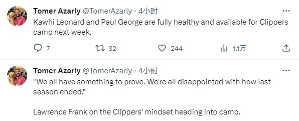 弗兰克透露,莱昂纳德和保罗-乔治现在完全恢复了健康,并且休赛期非常有成效,他们将全面参加球队训练营。