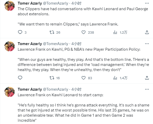 谈到与快船双巨的续约问题,弗兰克表示快船已经和莱昂纳德、保罗-乔治进行了续约谈判,这是一个过程,快船希望继续围绕这两位球星进行建队。
