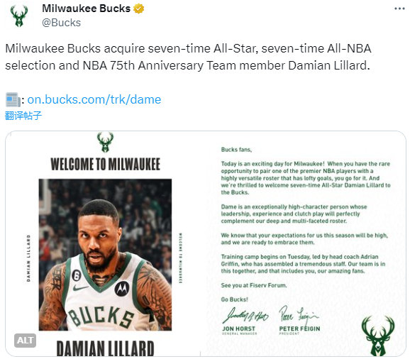 雄鹿队总经理乔恩-霍斯特发表声明,表示:达米安-利拉德是我们联盟中的精英球员,也是我们长期以来的球迷。这些机会很难得,我们非常感谢我们的社区和球队有这个机会,非常高兴欢迎达米安和他的家人来到密尔沃基雄鹿队。他的性格、竞争力、天赋和经验补充了我们的团队,让我们有最好的机会在最高水平上获胜,共同创造新的回忆。