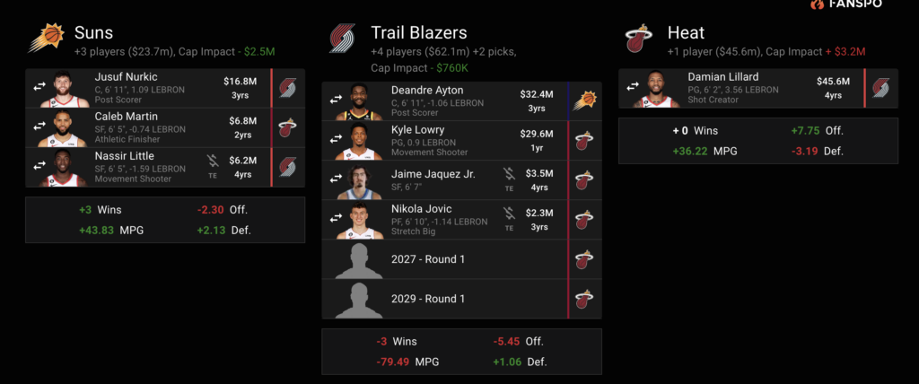 太阳送走艾顿,得到努尔基奇、马丁和利特尔;开拓者送走利拉德和利特尔,得到艾顿、洛瑞、约维奇、小海梅-哈克斯和2次首轮签;热火则是送出一大批资产最终得到利拉德。