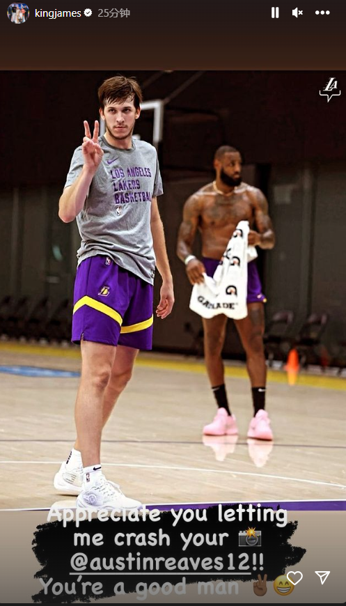 湖人两员大将合练,里夫斯眼神凶狠,冲着镜头比V;詹姆斯赤膊站在后面成为背景;之后詹姆斯转发合影,并且配文写道:感谢你允许我抢你的镜头,里夫斯!你是一个好人。