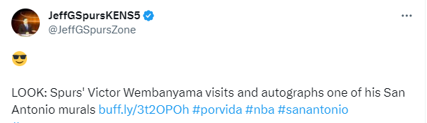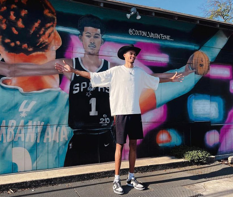 178直播09月26日讯 近日马刺状元文班亚马现身街头,并且与自己的巨幅壁画合影,文班亚马身穿短裤短袖、戴着牛仔帽、笑着伸开双臂,凸显异于常人的臂展,文班亚马还为壁画签名;壁画中,文班亚马身穿马刺1号球衣并且单手抓球。