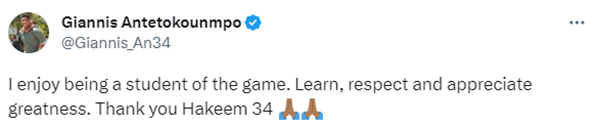 不久前,字母哥晒出他与大梦奥拉朱旺的合影,发推 写道:我很享受成为篮球比赛的学生。学习、尊重和感激伟大。谢谢你奥拉朱旺34号。