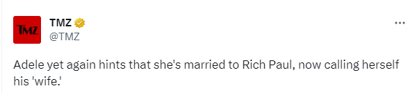 阿黛尔公开称她是里奇-保罗的妻子,再次暗示她已经结婚了;一周前,阿黛尔曾在演唱会现场称里奇是她的丈夫,难道他们真的已经秘密结婚了吗?目前阿黛尔方面还没有回应此事,不过很明显,阿黛尔对这个男人很满意。