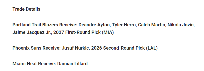 开拓者得到:艾顿、希罗、科雷布-马丁、尼古拉-约维奇、哈克斯、2027年首轮签(来自热火);