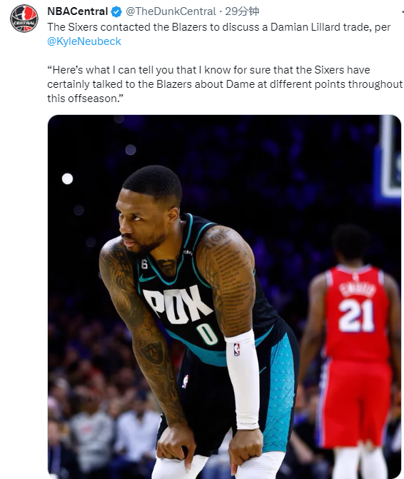 178直播09月24日讯 ,据76人随队记者Kyle Neubeck报道,76人在今年休赛期多次与开拓者就利拉德交易进行了交流,该记者表示:我看到了一些关于利拉德前往76人的流言,也许76人在这个过程中的参与度被低估了,我可以告诉你的是,我确信76人在休赛期的不同时间点都和开拓者就利拉德有过交流。