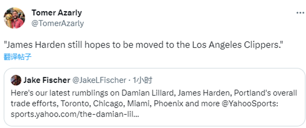 178直播09月23日讯,NBA名记Jake Fischer撰文报道利拉德和哈登的情况,消息人士透露,虽然利拉德的去留是更大的焦点,但哈登的未来目前同样悬而未决,哈登依然想被交易至快船;