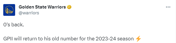 178直播09月22日讯,勇士官方正式宣布,小佩顿新赛季将会穿回0号球衣,官推晒照并且写道:0号回归,小佩顿将在2023-24赛季穿回他的老号码。