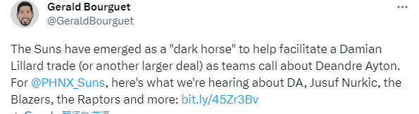 Gerald Bourguet报道,来自(交易市场上)最活跃的那些球队——76人、热火、开拓者、猛龙、公牛等球队的交易谈判正在升温,他们中的许多人认为太阳可能会推动一笔潜在的重大交易。