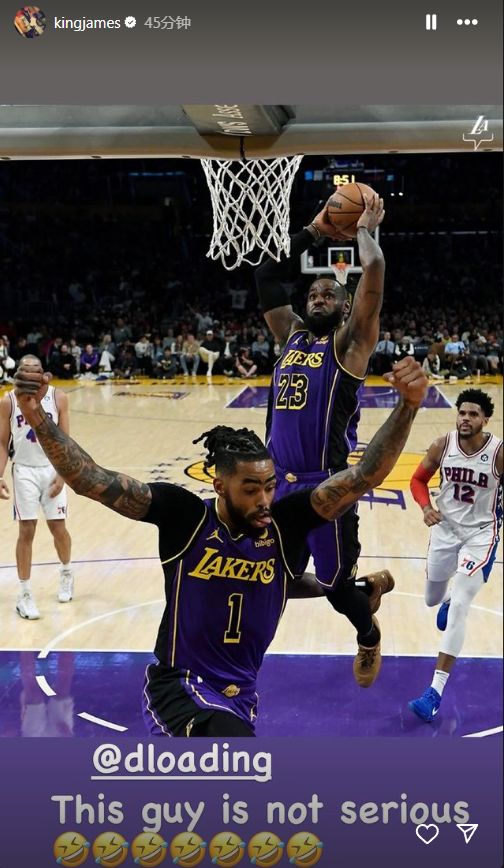 詹姆斯还晒出他与拉塞尔同框的热议画面——当时詹姆斯空接双手砸扣,拉塞尔兴奋起飞十分抢镜;老詹配文写道:这个家伙不是认真的(7个笑哭表情),拉塞尔转发并调侃:在我的脑海里,我跳起扣篮是因为海斯把球传给了我。