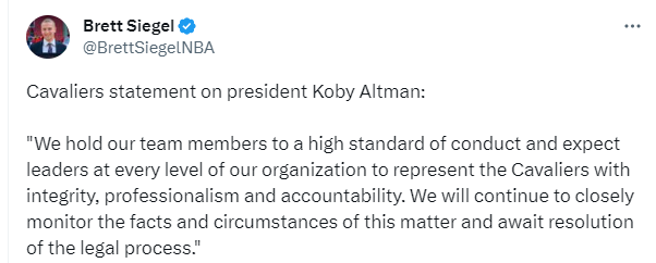 178直播09月21日,骑士总经理科比-奥尔特曼酒驾被逮捕更多内幕曝光,承认喝了酒;骑士官方再次发表声明:我们要求我们的团队成员保持高标准的行为,并期望我们组织的各级领导能够以诚信、专业和负责任的态度代表骑士队。我们将继续密切关注此事的事实和情况,并等待法律程序的解决。