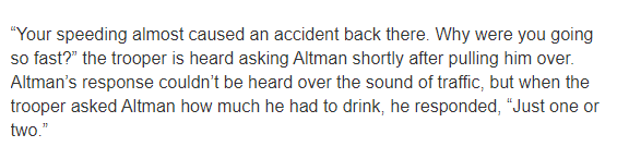 据悉,有人听到巡警拦下奥尔特曼后问:你的超速差点在后面造成事故。你为什么开得这么快?交通声中听不到奥尔特曼的回答,但当巡警问奥尔特曼喝多少酒时,他回答说:就一两杯。