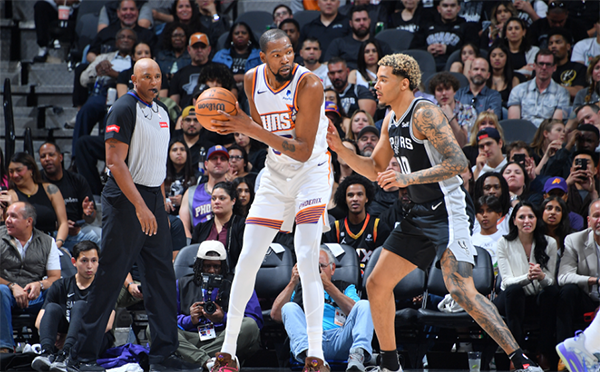 本赛季第3次对阵马刺,杜兰特开场主动防守文班亚马,进攻端面对索汉两次投篮都打铁不中,太阳9-8之后杜兰特连中三球帮助球队拉开分差;3分40秒KD下场休息,布克带队保持领先,太阳第一节26-17领先马刺9分;布克首节12分,杜兰特5中3拿到6分。