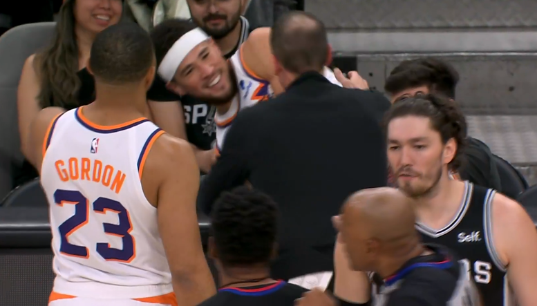 末节,比赛早早失去悬念,马刺直接换上纯替补阵容,比尔带队打了一会后也下场休息,比赛彻底沦为垃圾时间;杜兰特和布克都是三节打卡下班;太阳复仇马刺从而拒绝遭三杀。