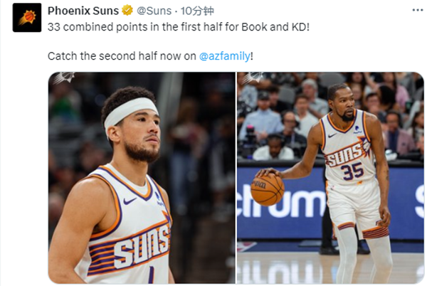 第二节,杜兰特继续防守文班,进攻端手感火热,单节7中5独砍11分,招牌杀招无解,外线空位三分一击即中,再加上众队友输送火力,半场打完太阳65-47领先18分;杜兰特和布克半场合砍33分,而且两人的效率很高;比尔半场6分但送出7次助攻。