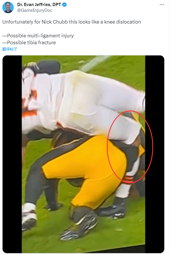 尼克-查布受伤一幕太恐怖——比赛期间,查布的左膝盖被对手撞伤,左膝反关节并且呈90度弯折;查布因伤退出比赛,据报道,布朗队担忧遭遇膝盖脱臼和韧带损伤而缺席本赛季,他将接受进一步的检查。