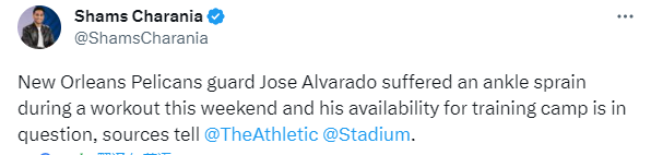 178直播09月18日,据名记shams报道,鹈鹕后卫阿尔瓦拉多在本周的一次训练中遭遇脚踝扭伤,是否能参加新赛季的训练营存疑;新赛季还没开打,鹈鹕接连遭遇伤病,阿尔瓦拉多扭伤脚踝归期未定,墨菲更是因伤预计伤停10-12周。