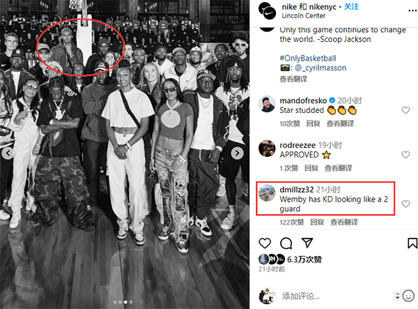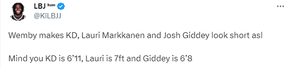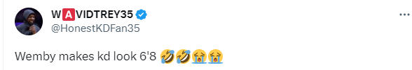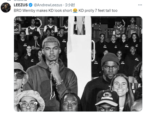 有球迷表示文班让杜兰特看起来像一个后卫;还有球迷表示文班让杜兰特显得很矮,KD大概也有7英尺高(笑哭表情)。