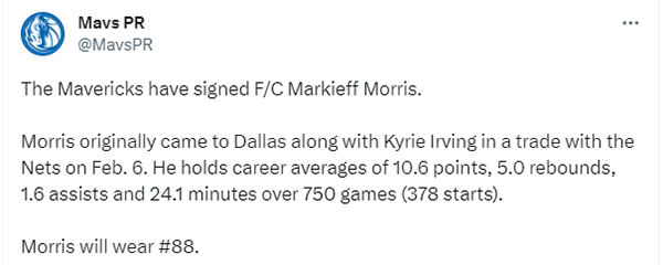 34岁的大莫里斯正式重返独行侠,他是在22-23赛季交易截止日前在篮网与独行侠关于欧文的交易中被送到达拉斯的,上赛季,大莫身穿13号球衣为独行侠出战8场比赛,场均仅上场8.8分钟能得到4.5分1.5篮板。