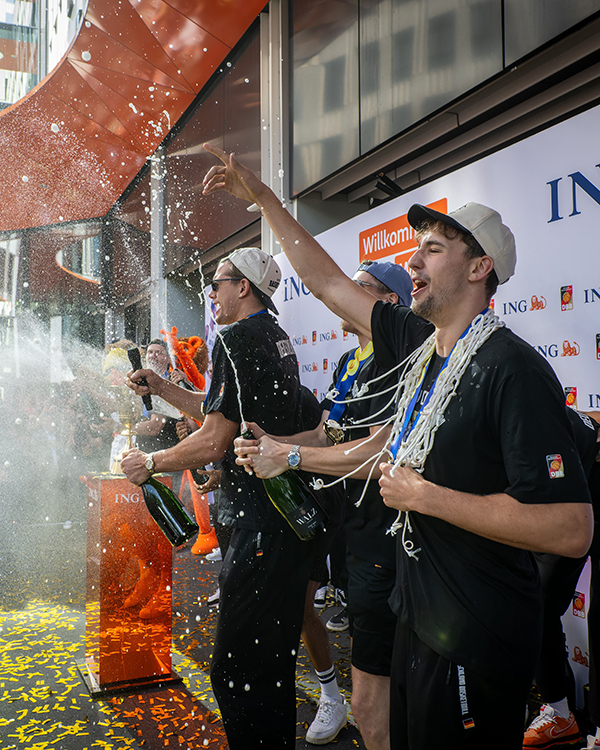今日,德国男篮在德国法兰克福市庆祝夺得世界杯冠军,在夺冠庆典现场,德国众将都身穿印有“2023年世界冠军”字样的黑色T恤;大瓦格纳和其他球员狂喷香槟庆祝,小瓦格纳把荣誉篮网挂在脖子上;现场早已撒满了金色彩带,德国球迷都掏出手机记录这一刻。