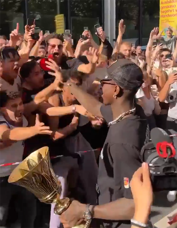 施罗德握着本届世界杯的冠军奖杯,与德国球迷们亲切互动——击掌以及给球迷签名,享受着现场此起彼伏的MVP呐喊声。
