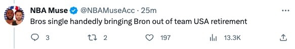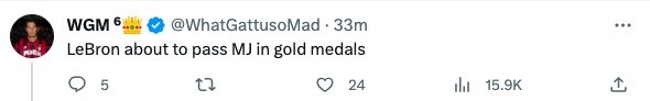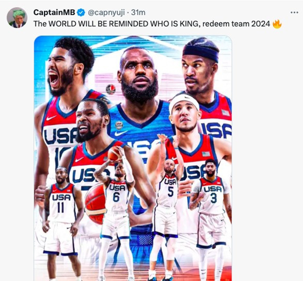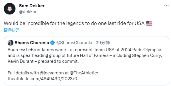 Shams随后补充道,詹姆斯很早就在为此(集结球星出战奥运)付出努力,这与美国男篮今年的输赢没有关系;詹姆斯、杜兰特和库里三人已经就最后一次参加美国队的比赛有过交流;他们都把巴黎奥运会视为自己国家队生涯的“最后一舞”。