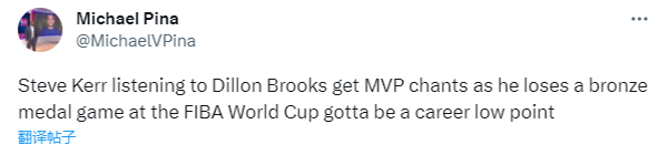 美媒The Ringer记者Michael Pina赛后发推写道:“这就是科尔生涯的最低点了,在输掉铜牌争夺战的同时,他还听到观众高呼狄龙-布鲁克斯是MVP。