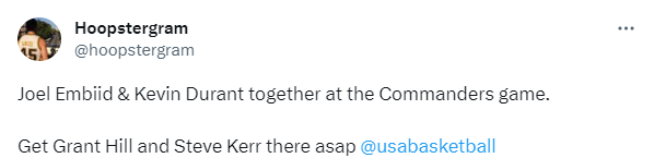 今年篮球世界杯,美国队连一块奖牌都没有拿到,球迷希望杜兰特和恩比德能够为美国男篮出征巴黎奥运会。