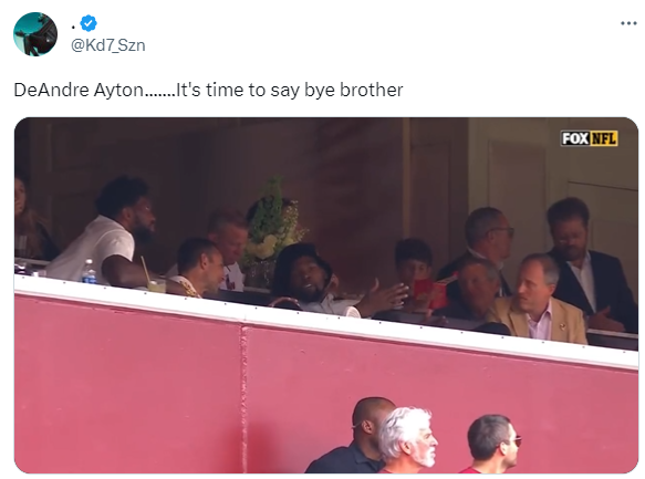 戴着小黑帽的杜兰特和恩比德一起坐在华盛顿指挥官队的老板席观看比赛,杜兰特和别人有说有笑聊得很开心,恩比德坐在一旁,之后他也扭头和别人互动;76人老板约什-哈里斯盯着他们看,似乎对杜兰特的谈话很感兴趣。