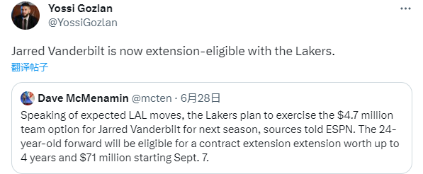今夏,湖人执行范德比尔特的价值470万美元的球队选项,9月8日有资格获得与湖人提前续签4年7100万美元的大合同