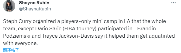 据报道,库里今日在洛杉矶举办了一个仅球员参加的勇士迷你训练营,除了回到欧洲参加FIBA赛事的萨里奇,勇士队其他球员都参加了。勇士新秀波杰姆斯基和杰克逊-戴维斯还称,这个迷你训练营帮助大家互相熟悉。