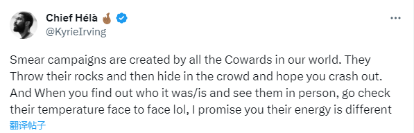 哈登前队友欧文为哈登鸣不平,发推写道:诋毁与抹黑是世界上所有的懦夫所为,他们肆意批判别人然后躲在人群中等着看笑话,当你发现他是谁并亲自见到他们、与他们面对面对峙的时候,哈哈,我向你保证他们会变得很怂。