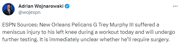 178直播09月06日,新赛季还没到来,鹈鹕遭遇伤病打击,据名记Woj报道,鹈鹕前锋特雷-墨菲三世在今天的训练中遭遇左膝半月板受伤的伤病,他将接受进一步的检查,目前还不清楚墨菲是否需要手术。