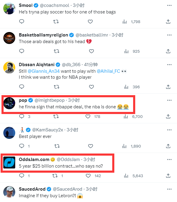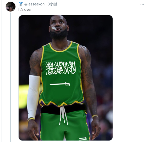 詹姆斯现身沙特引热议,有球迷调侃:他终于签下了姆巴佩的合同(1年7.76亿美元),NBA已经玩完了;有球迷表示:5年250亿美元,谁能说不?想象一下,如果他们买断勒布朗?还有球迷直接晒出詹姆斯身穿沙特球队绿色球衣的P照;另有球迷晒出詹姆斯旧照:我将会把我的天赋带到沙特阿拉伯。