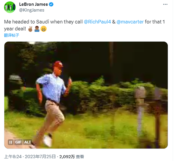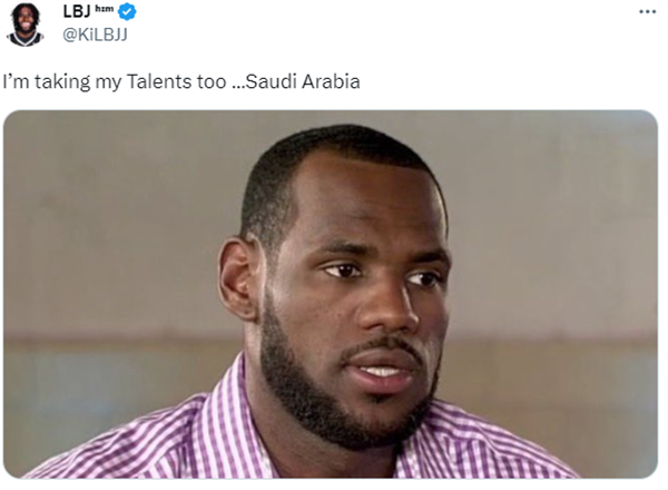 38岁的詹姆斯受邀造访沙特,并与当地的潜力球员进行了一场友谊训练赛;当初记者报道沙特球队为姆巴佩开出1年7.76亿美元超级顶薪合同时,詹姆斯曾在发推写道:“当他们给里奇-保罗(经纪人)和马弗里克-卡特(商业伙伴)打电话时,我就要去沙特签下一年的合同了。
